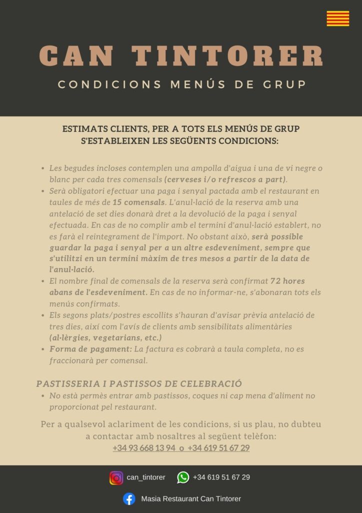 - En cas de voler substituir el postre del menú per un pastís de pastisseria, cal consultar prèviament amb el restaurant.
