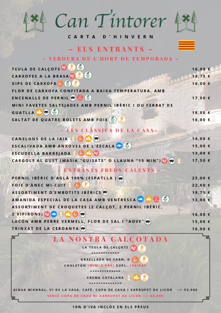 Quan arriben els dies freds, a Can Tintorer renovem la nostra oferta gastronòmica amb plats reconfortants, intensos i plens de sabor. La carta d’hivern està pensada per gaudir dels ingredients de temporada, combinant productes de proximitat amb receptes que conviden a compartir i viure l’hivern amb calidesa.