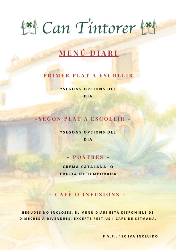 De dimecres a divendres, a Can Tintorer t’oferim un menú pensat per gaudir d’un àpat casolà, variat i equilibrat. Cada dia elaborem plats amb productes frescos de temporada, combinant tradició i sabor.